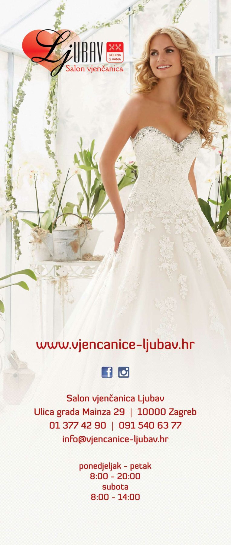 Salon vjenčanica „Ljubav“ modni je obrt koji već skoro dvadeset godina stvara mnoge inspirativne, unikatne, uvijek prepoznatljive kolekcije vjenčanica i svečanih haljina. Tim zaposlenika Salona vjenčanica Ljubav visoko je educiran, motiviran i uvijek spremno stoji na raspolaganju, a njihovu ljubav prema ovom poslu osjete i mladenke, koje se u salonu uvijek osjećaju ugodno i dobrodošlo.