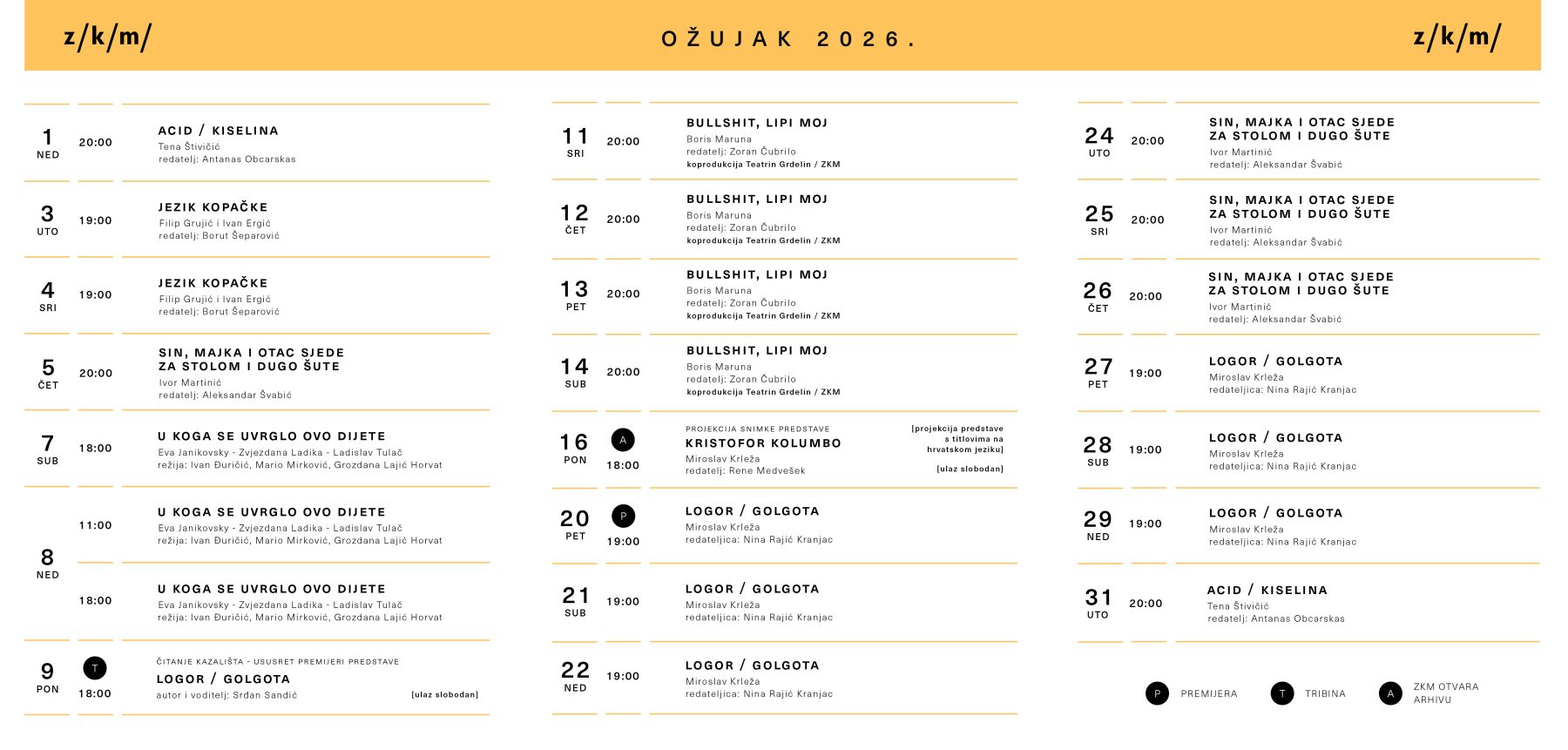U ožujku vas očekuje nova predstava Logor / Golgota u režiji nove zvijezde europskog teatra, slovenske redateljice Nine Rajić Kranjac. Redateljica koju je britanski časopis The Stage prošle godine uvrstio među pet najperspektivnijih europskih redatelja u autorskom projektu spaja Krležine drame U logoru i Golgota u jedinstvenu cjelinu, taj se proces čita kao dijagnoza našeg trenutka – kao ogledalo Europe koja se ponovno uči jeziku rata. Kako sama navodi, ovim susretom s Krležom želi uznemiriti najmlađu generaciju koja je pozvana na vojni rok.